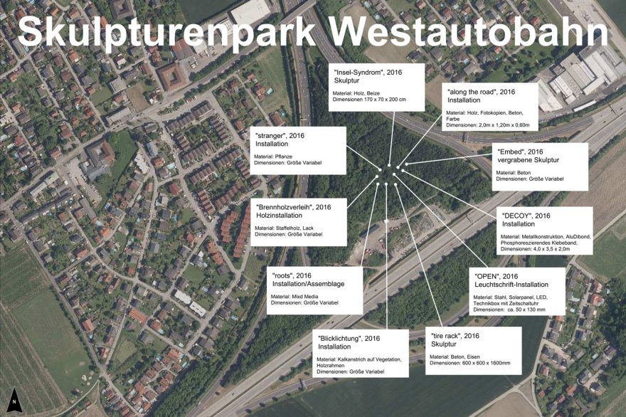 In summer 2016 a sculpture park was created at the Linz interchange, the junction of the A1 and A7 motorways. Almost unnoticed by the world outside, eleven artists installed secretly projects on this quasi-insular expanse. The odd atmosphere and the characteristics of this isolated patch of land provided the impulse for the artworks and at