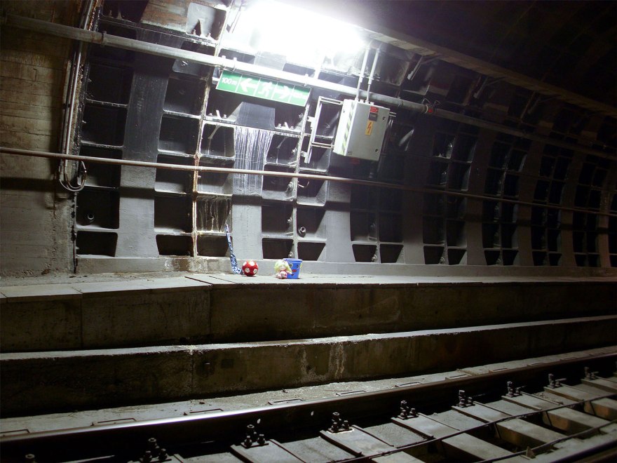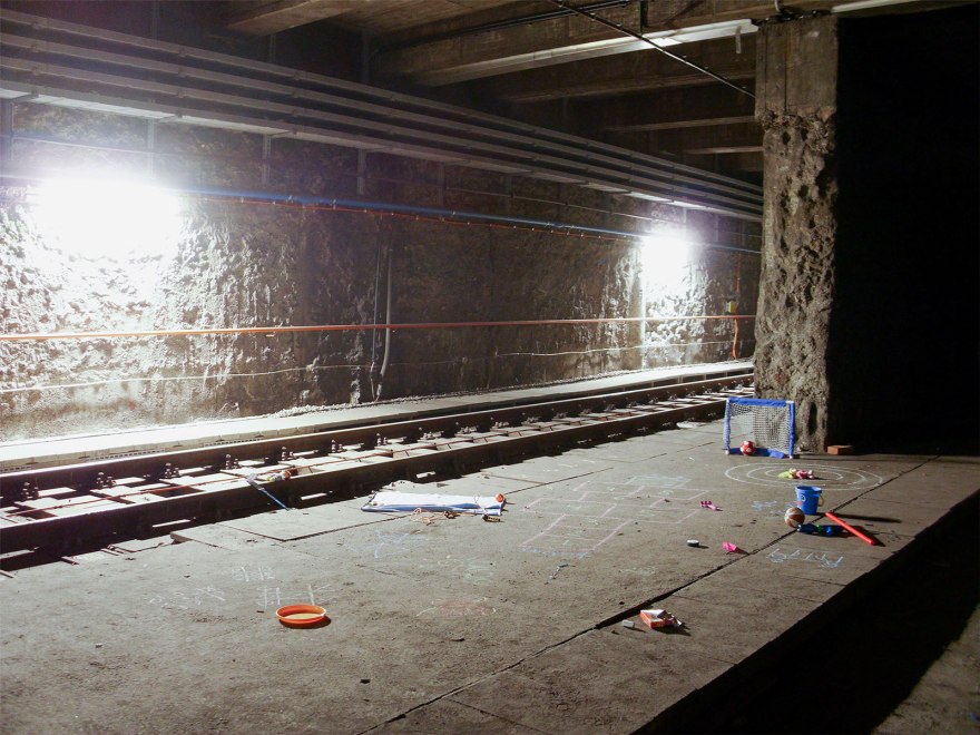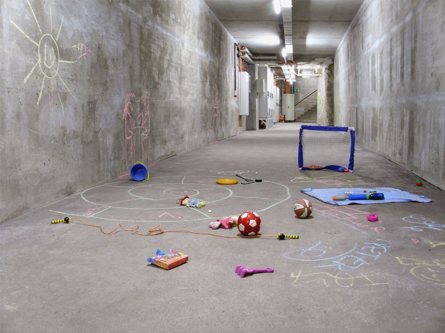 Playgrounds is a series of interventions in subway tunnels and infrastructural underground areas of the Vienna Metro. Chalk drawings and toys seem to prove that children were playing in these strange environments. The photographs show places that are inaccessible to us in everyday life. However, by their rough character they have an unique aesthetic quality.